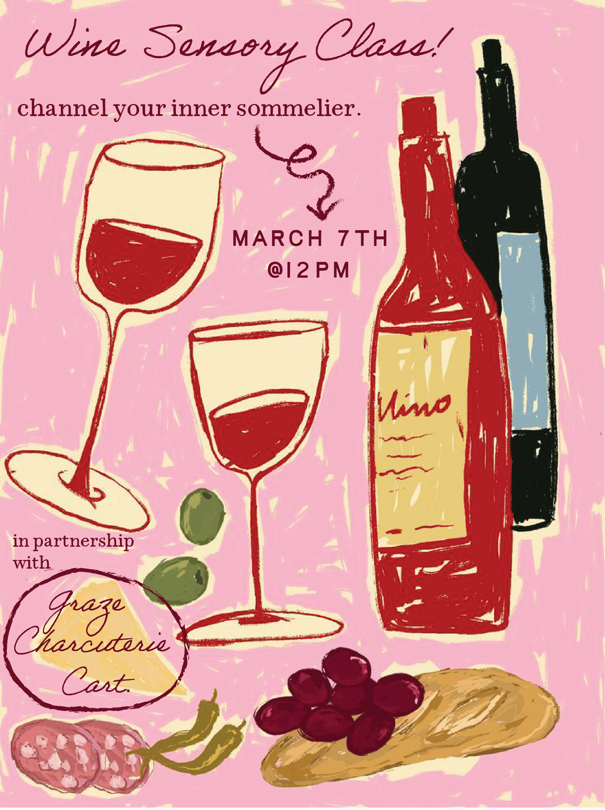 This class includes 30 min instruction by Lindsay - our in house sommelier, and instruction materials which include four 2.ozpours of wine, and food samples for the sensory experience!Post class, make your own charcuterie board from the Graze Charcuterie Cart and have your favorite glass of wineto pair with it on us!